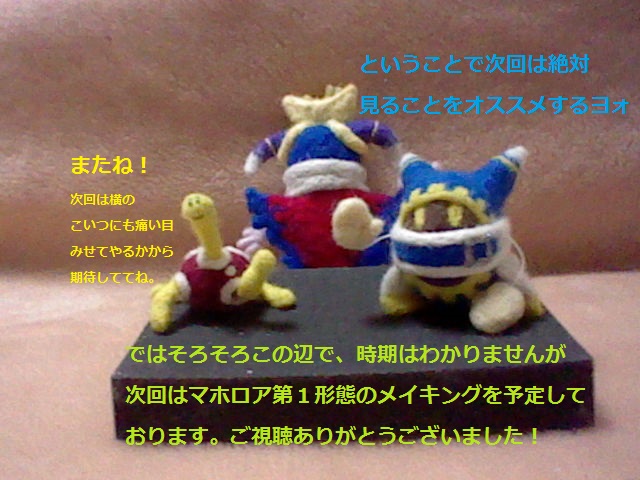 とまあ作ったのはマホロア第一形態です、今年の5月頃になりますね、カービィの誕生日でリクエスト募集したときに作ったものですね、リクエスト自体はマホロアのどれかの形態ということだったのですが別な方にウルトラソードのリクエストも頂いていたのでゲームでの展開的に第一形態にしました。写真は撮り直したのですが展開的に使えなかったのでこっちに